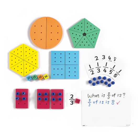 Kit de frações e quantidades especialmente desenvolvido em colaboração com professores de matemática com o objetivo de ajudar as crianças a compreenderem a fração de quantidades.