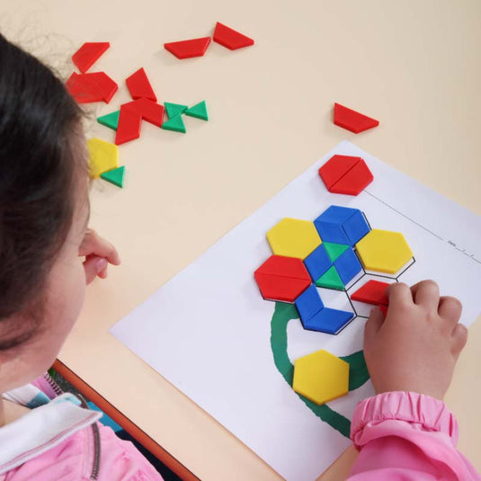 Bloques estándar (250 piezas), compuestos por hexágonos regulares (amarillos), trapecios isósceles (rojos), rombos (azules y beige), cuadrados (naranjas) y triángulos (verdes). Todas las piezas tienen lados de igual longitud, lo que permite yuxtaponerlas.
